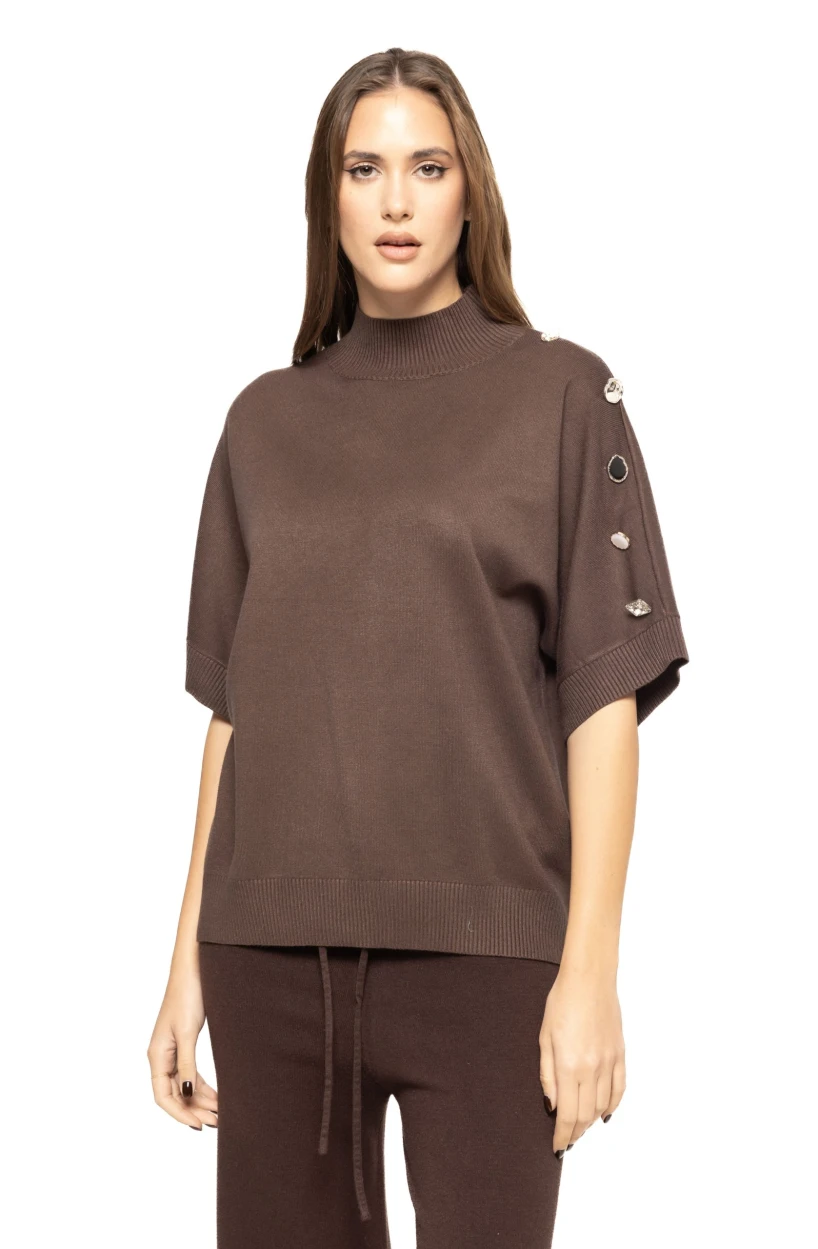 Ceea ce îl face cu adevărat special sunt aplicațiile de pietre dispuse pe umăr, un detaliu statement care adaugă personalitate și rafinament ținutei. Aceste aplicații sunt atent fixate, pentru a rezista în timp, și au un aspect sofisticat, inspirat din moda glamour. Contrastul dintre textura moale a tricotului și strălucirea pietrelor creează un efect vizual aparte, ideal pentru femeile care își doresc piese moderne, dar cu un plus de eleganță.