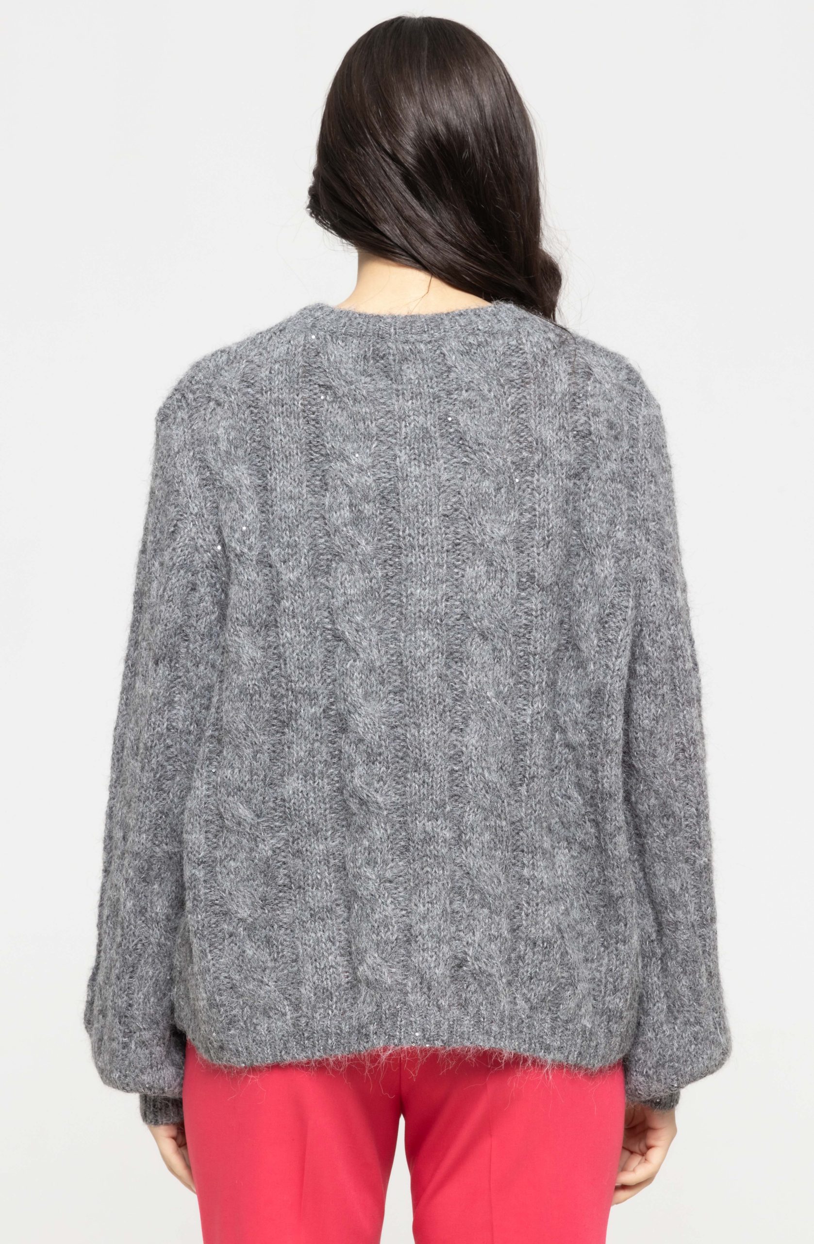 Puloverul gros Natalia este realizat dintr-un amestec de fibre de calitate, care îi conferă atât durabilitate, cât și un confort deosebit la purtare. Textura sa este moale și delicată, iar croiul lejer permite o mișcare liberă, fără a restricționa mobilitatea. Mânecele bufante și volanele delicate de la manșete adaugă un strop de feminitate, iar designul clasic cu guler rotund face acest pulover ușor de asortat cu orice tip de ținută.