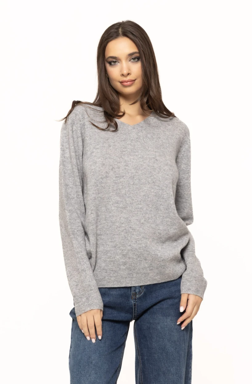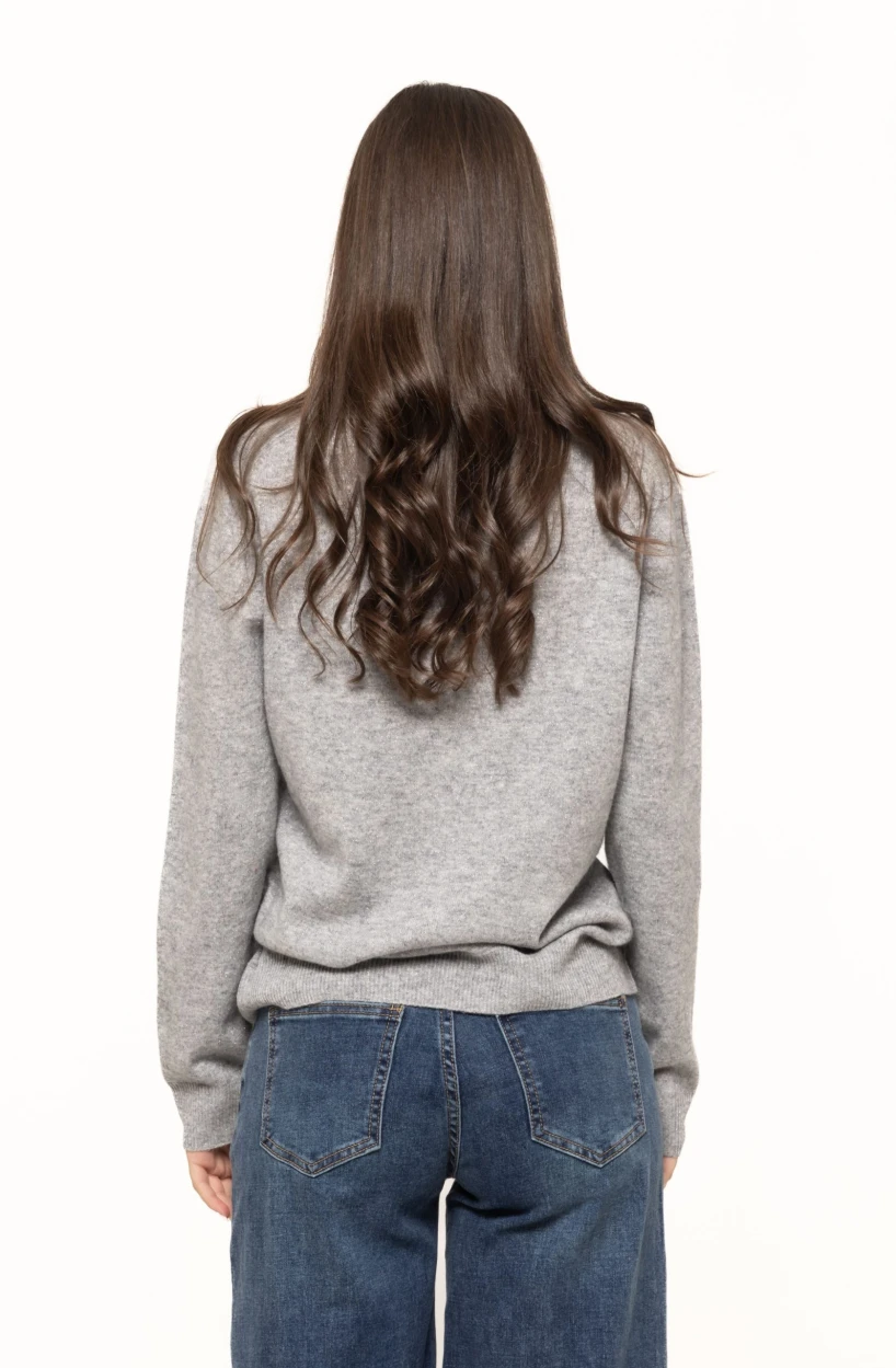 Gulerul discret, feminin, completează perfect designul puloverului. Nu este nici prea larg, nici prea strâmt, ceea ce îl face ușor de purtat cu diferite tipuri de coliere, accesorii sau eșarfe. Este un pulover ideal pentru layering, putând fi combinat cu cămăși subțiri, geci de piele, paltoane elegante sau jachete casual. Datorită versatilității sale, se potrivește atât stilului minimalist, cât și ținutelor glam de seară, oferind un look impecabil în orice context.