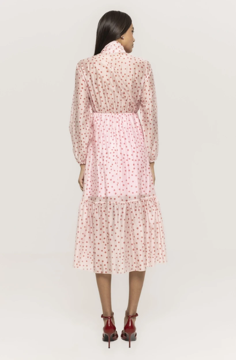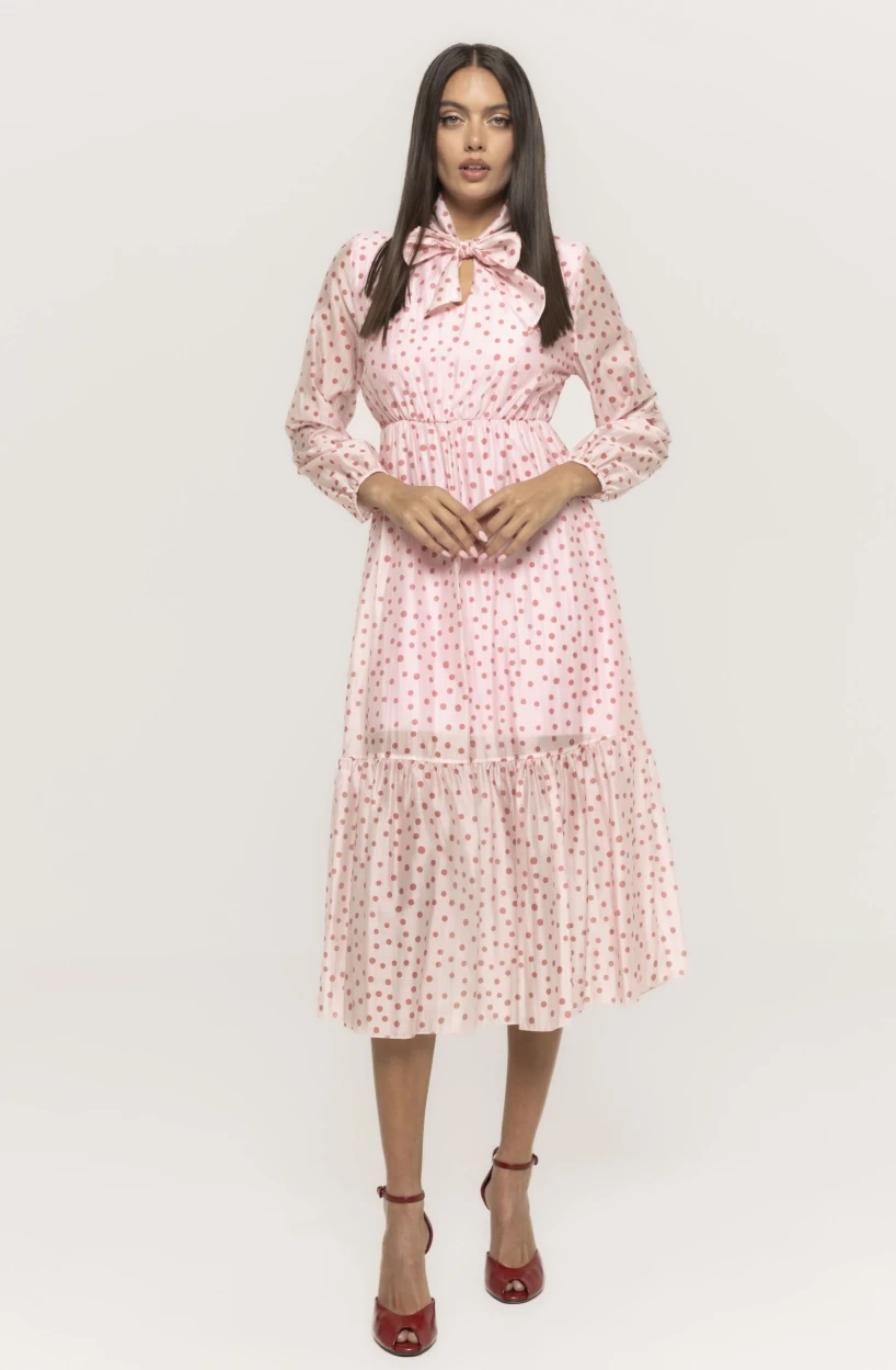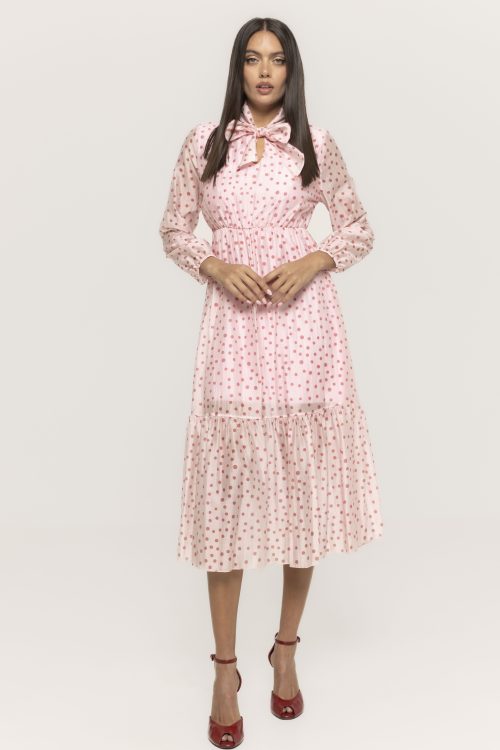 Versatilitatea este unul dintre marile atuuri ale acestui model. Rochia cu fundă și buline Angelina poate fi purtată cu pantofi stiletto și accesorii elegante pentru un look sofisticat de eveniment sau întâlnire specială. În același timp, poate fi integrată cu ușurință într-o ținută de zi prin asocierea cu balerini, loafers sau sandale delicate pentru o apariție chic și relaxată. Adăugând un blazer structurat sau un trench elegant, poți transforma instant această rochie într-un outfit office stylish și modern.
