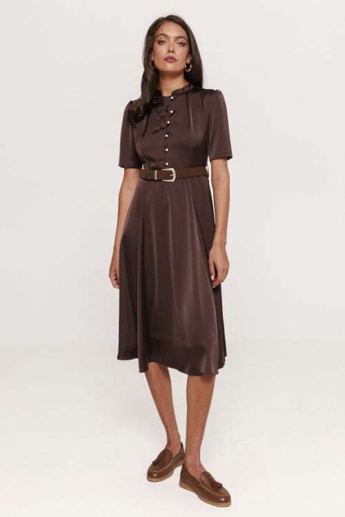 Croiala rochiei cu nasturi aplicați Alina este gândită pentru a flata diferite tipuri de siluetă. Linia sa echilibrată, ușor cambrată în talie, oferă un efect armonios și feminin, în timp ce lungimea și proporțiile sunt atent alese pentru a crea un look elegant și actual. Această rochie poate fi purtată atât în contexte casual, cât și în situații mai formale, în funcție de accesorizare.