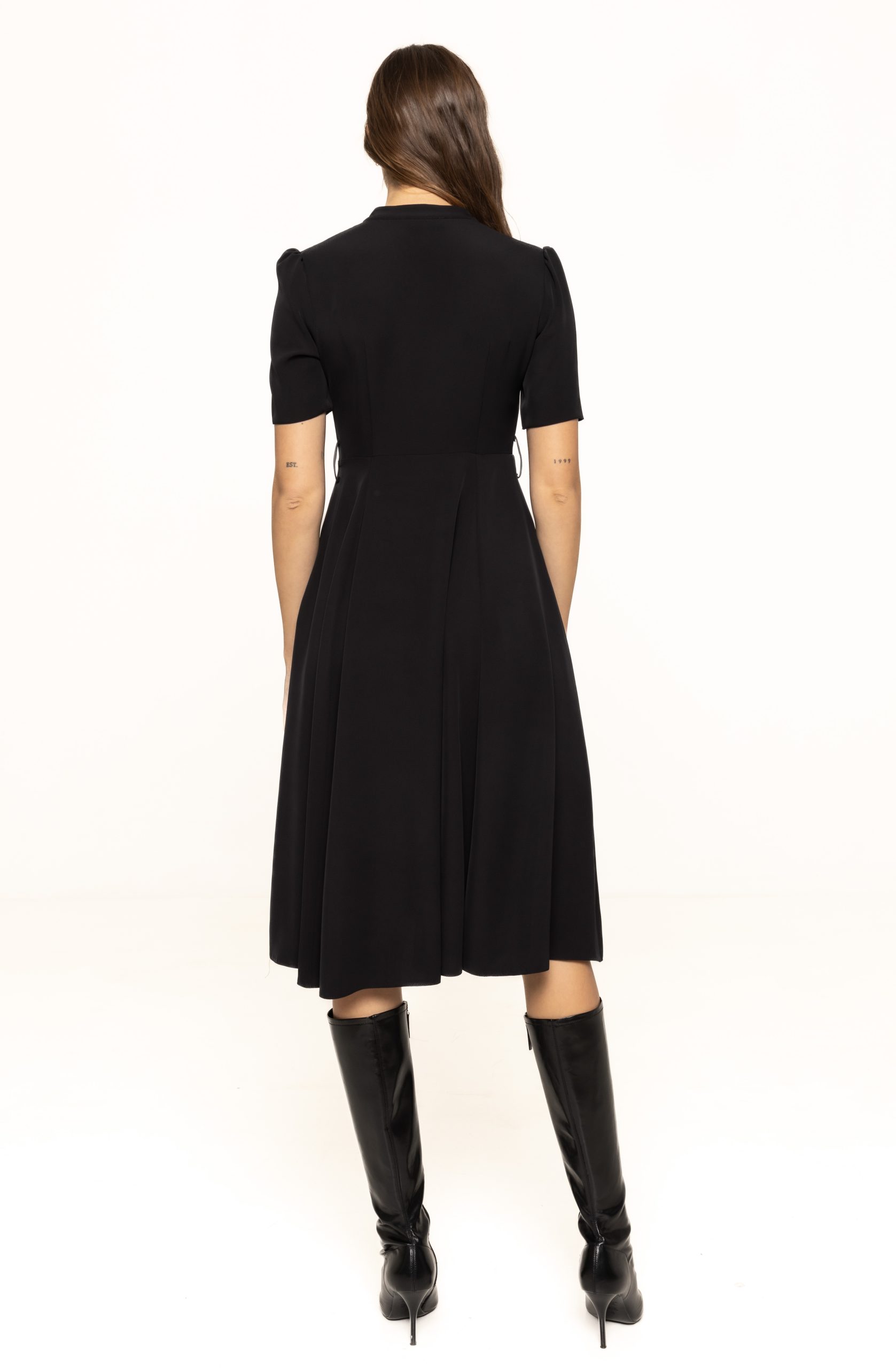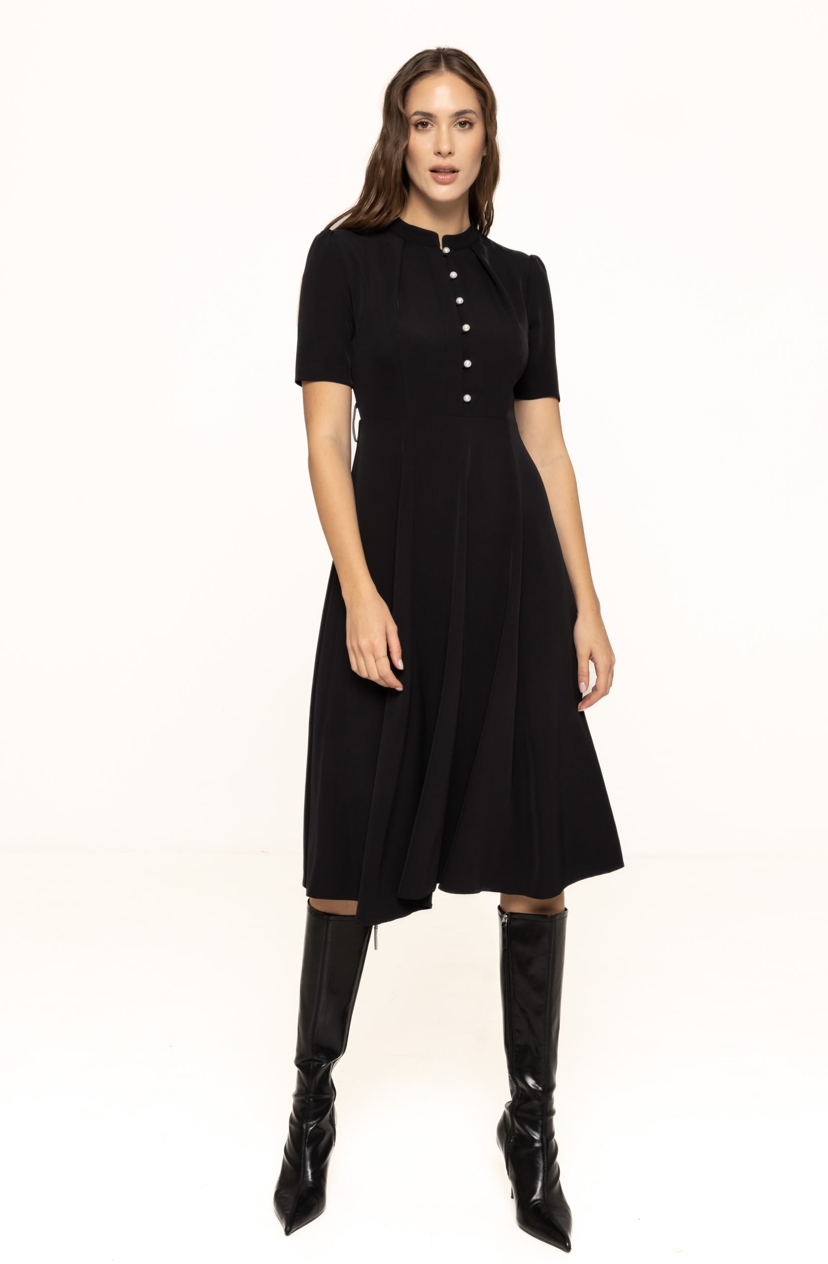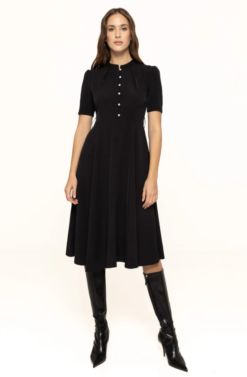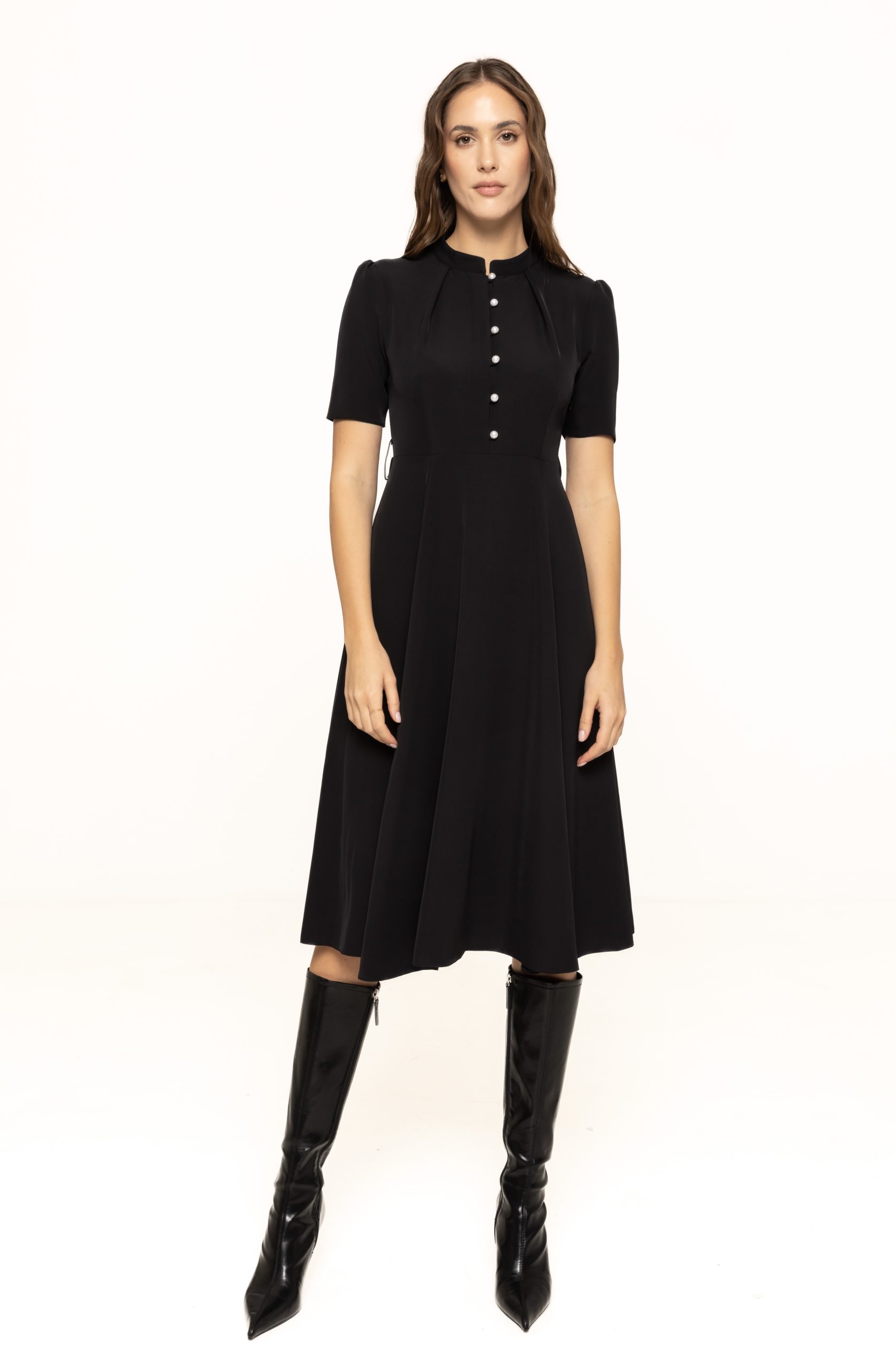 Nasturii aplicați sunt elementul care conferă unicitate modelului Paula. Realizați cu atenție la detalii, aceștia adaugă un plus de personalitate și eleganță, fără a încărca designul. Sunt suficient de vizibili pentru a atrage privirea, dar destul de discreți pentru a păstra rafinamentul piesei. Această combinație îi transformă într-un accent estetic deosebit, perfect pentru femeile care preferă piese minimaliste cu detalii atent lucrate. Nasturii oferă rochiei un aer modern, ușor sofisticat, fiind în același timp practici și decorativi.