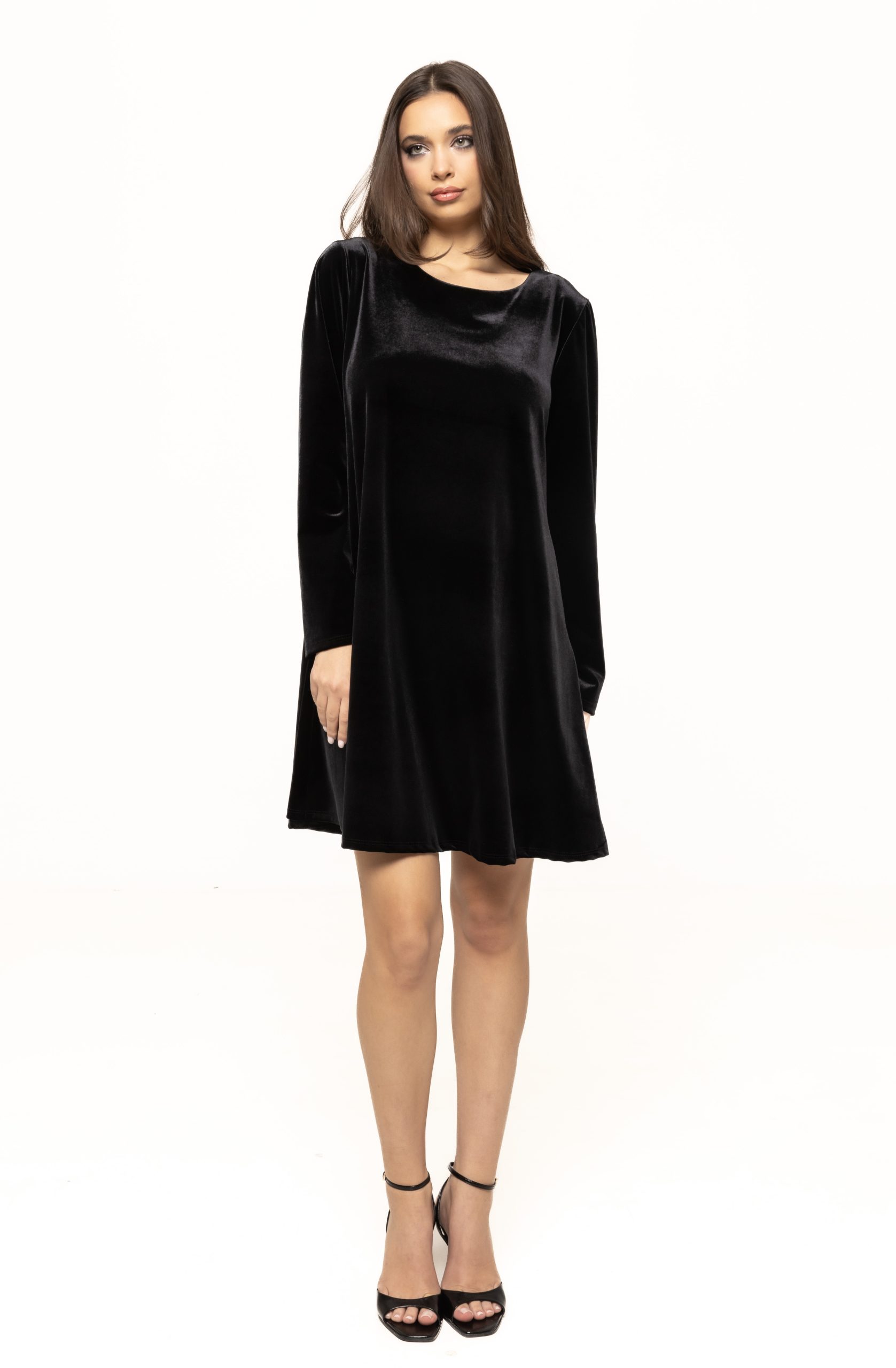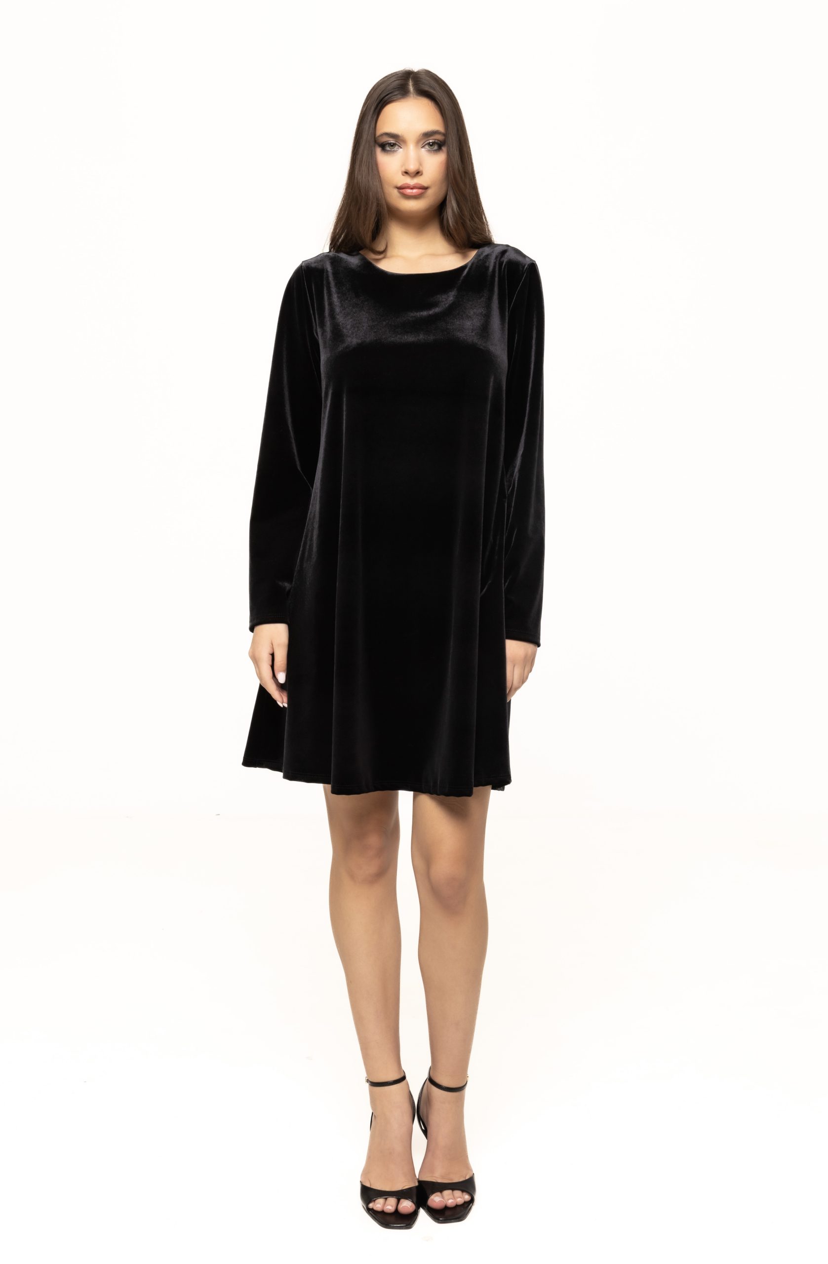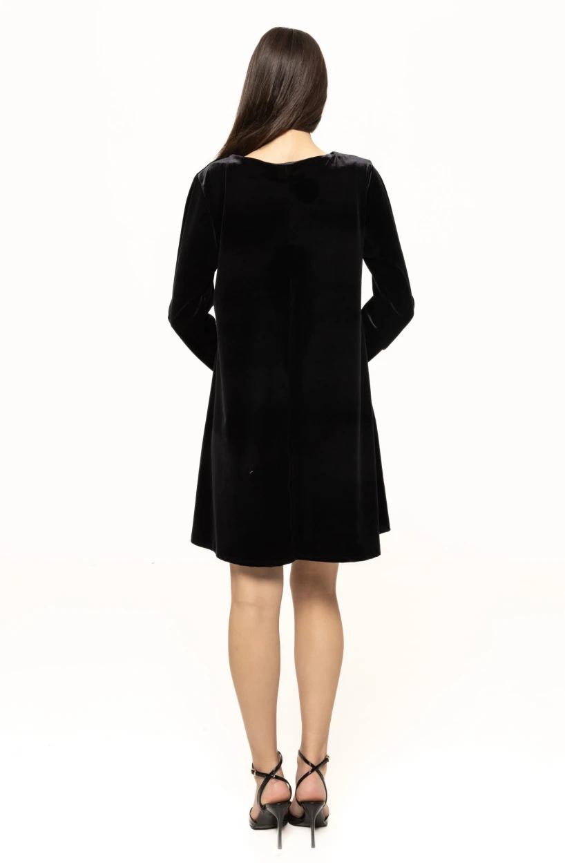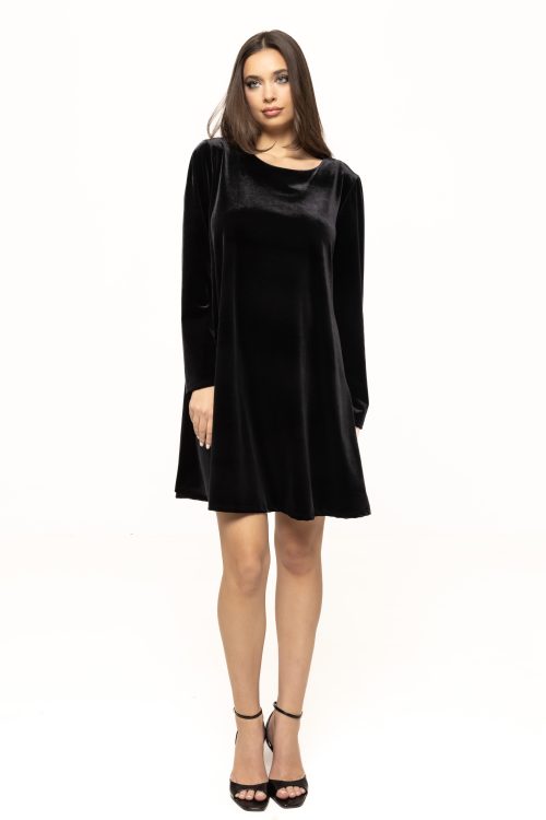 Materialul moale, fin și ușor elastic asigură o purtare confortabilă și plăcută, adaptându-se armonios formelor corpului fără a limita libertatea de mișcare. Catifeaua are un aspect nobil, iar reflexiile sale subtile oferă rochiei o notă de strălucire perfectă pentru evenimentele speciale. Este genul de piesă care atrage privirile instant, dar într-un mod elegant, echilibrat, lipsit de exagerări. Mâneca lungă adaugă un plus de rafinament și face rochia potrivită pentru sezonul toamnă-iarnă, pentru petrecerile de sărbători, seri elegante sau evenimente formale.