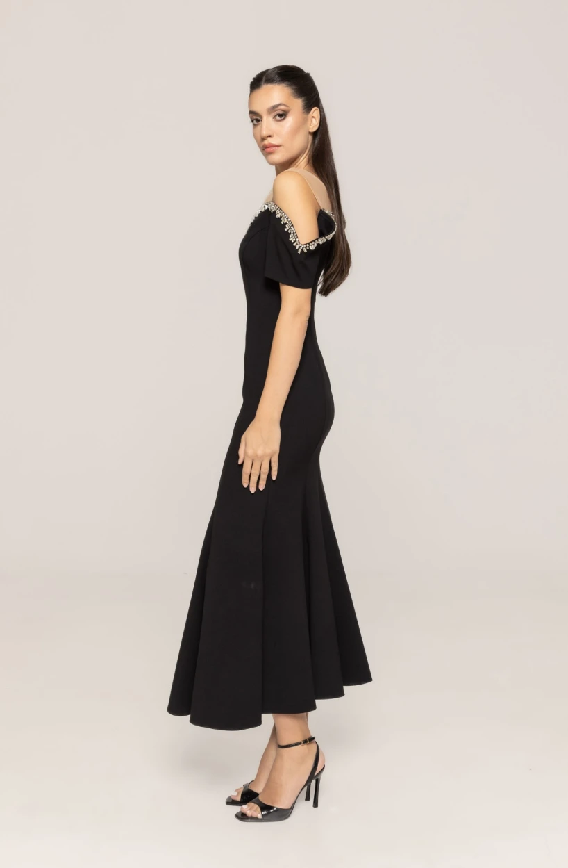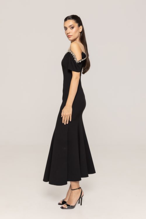 Croiala rochiei urmărește delicat liniile corpului, accentuând talia și oferind o siluetă alungită și grațioasă. Decolteul cu umerii goi adaugă un plus de senzualitate discretă, păstrând totuși aerul elegant, ceea ce o face o alegere excelentă pentru cine de gală, cocktail-uri, recepții sau chiar petreceri aniversare.