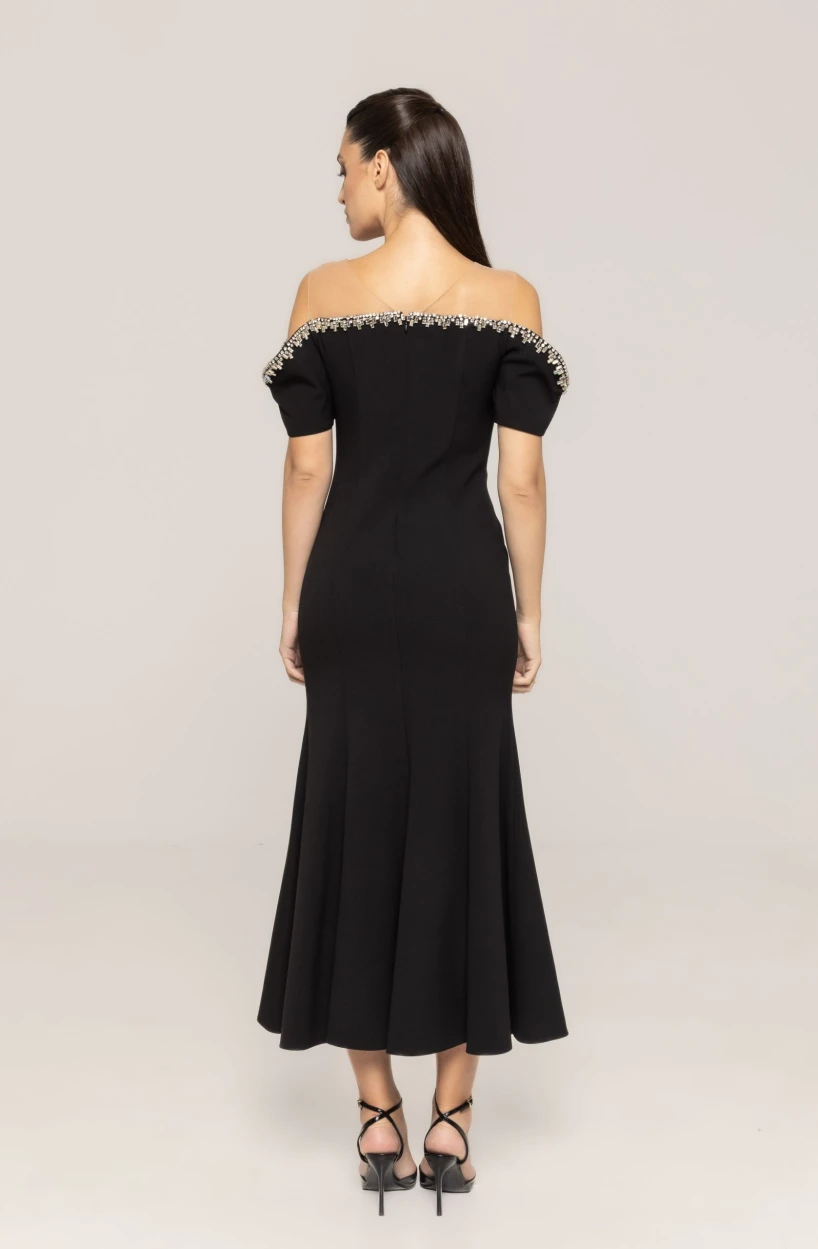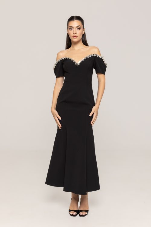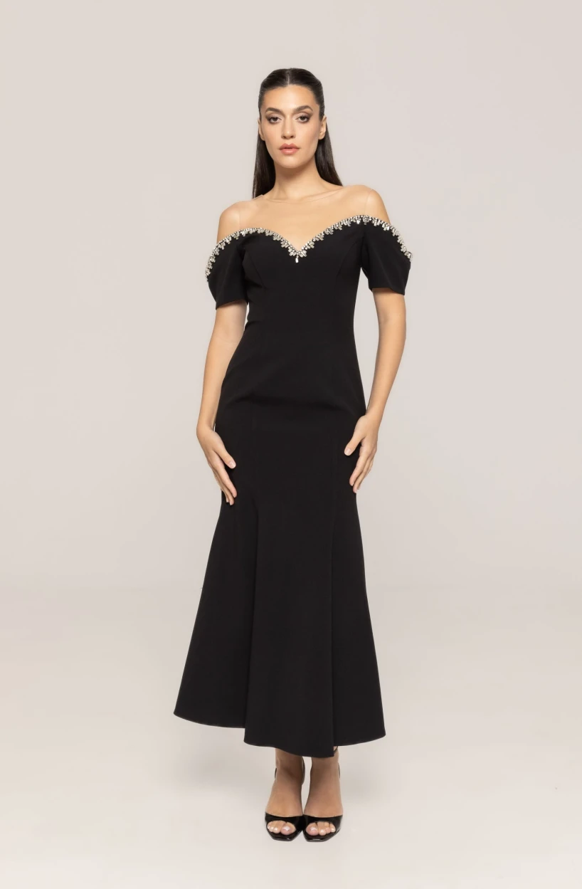 Rochie elegantă midi cu umeri goi Daria – rafinament și feminitate în fiecare detaliu
