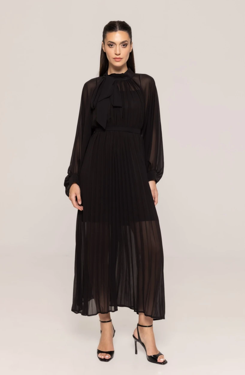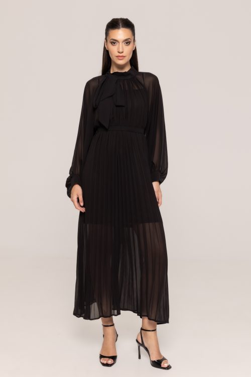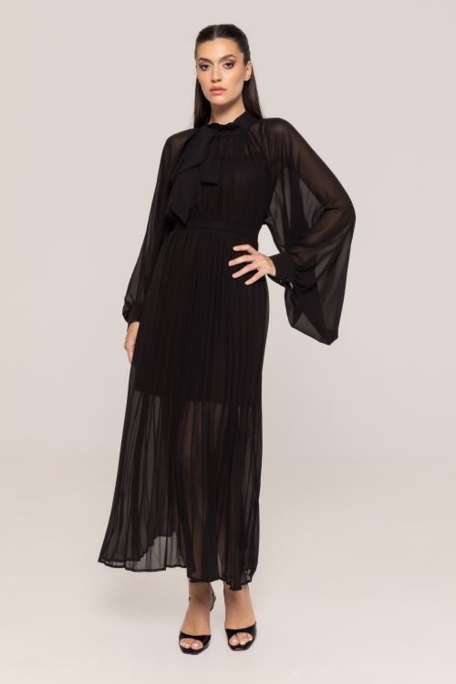 Unul dintre punctele centrale ale acestei creații este funda amplasată la gât, un detaliu feminin și expresiv, care adaugă un plus de personalitate ținutei. Rochia elegantă plisată cu fundă Rose pune accent pe echilibrul perfect dintre modern și clasic, fiind concepută pentru femeile care doresc să inspire încredere și rafinament.