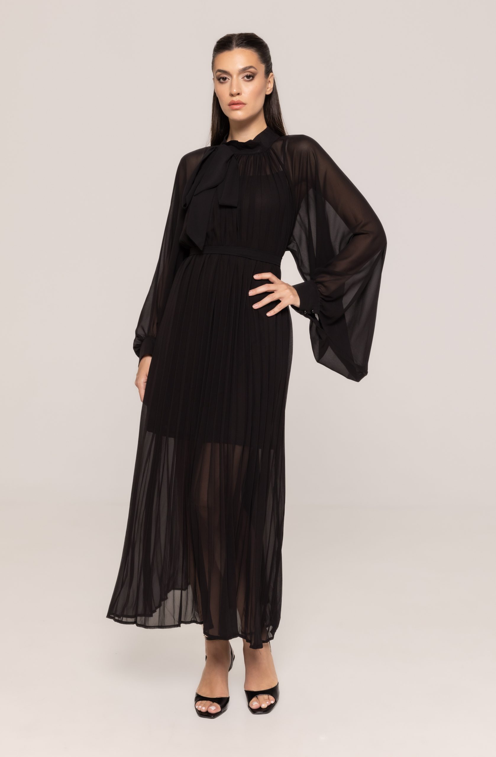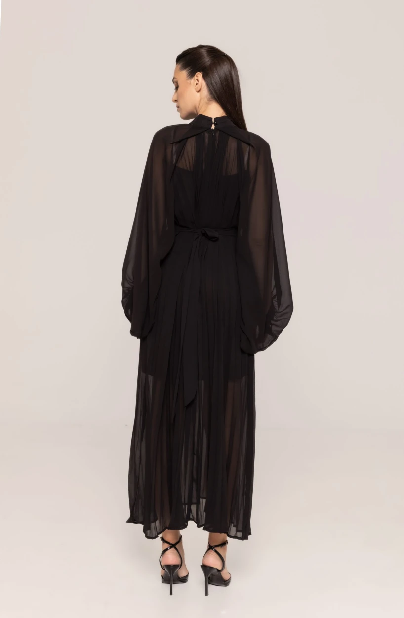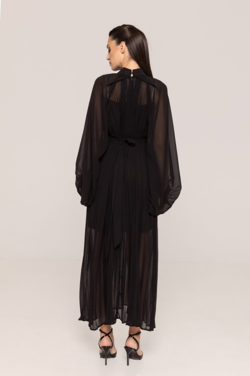 Această rochie este realizată dintr-un material lejer și vaporos, cu textură plăcută, care se așază armonios pe siluetă. Pliseurile verticale alungesc vizual linia corpului, oferind impresia unei siluete mai înalte și mai subțiri. Croiul accentuează talia într-un mod delicat, păstrând în același timp libertatea de mișcare, esențială pentru confort pe durata întregii zile sau seri.