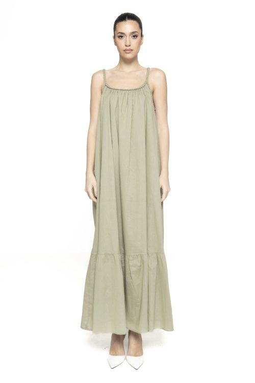 Bretelele subțiri adaugă un plus de delicatețe și feminitate, lăsând umerii descoperiți într-un mod subtil și elegant. Decolteul rotund, ușor adunat, completează designul simplu și rafinat, oferind un aer romantic și natural. În partea inferioară, volanul amplu adaugă mișcare și volum, contribuind la un efect vizual spectaculos la fiecare pas.