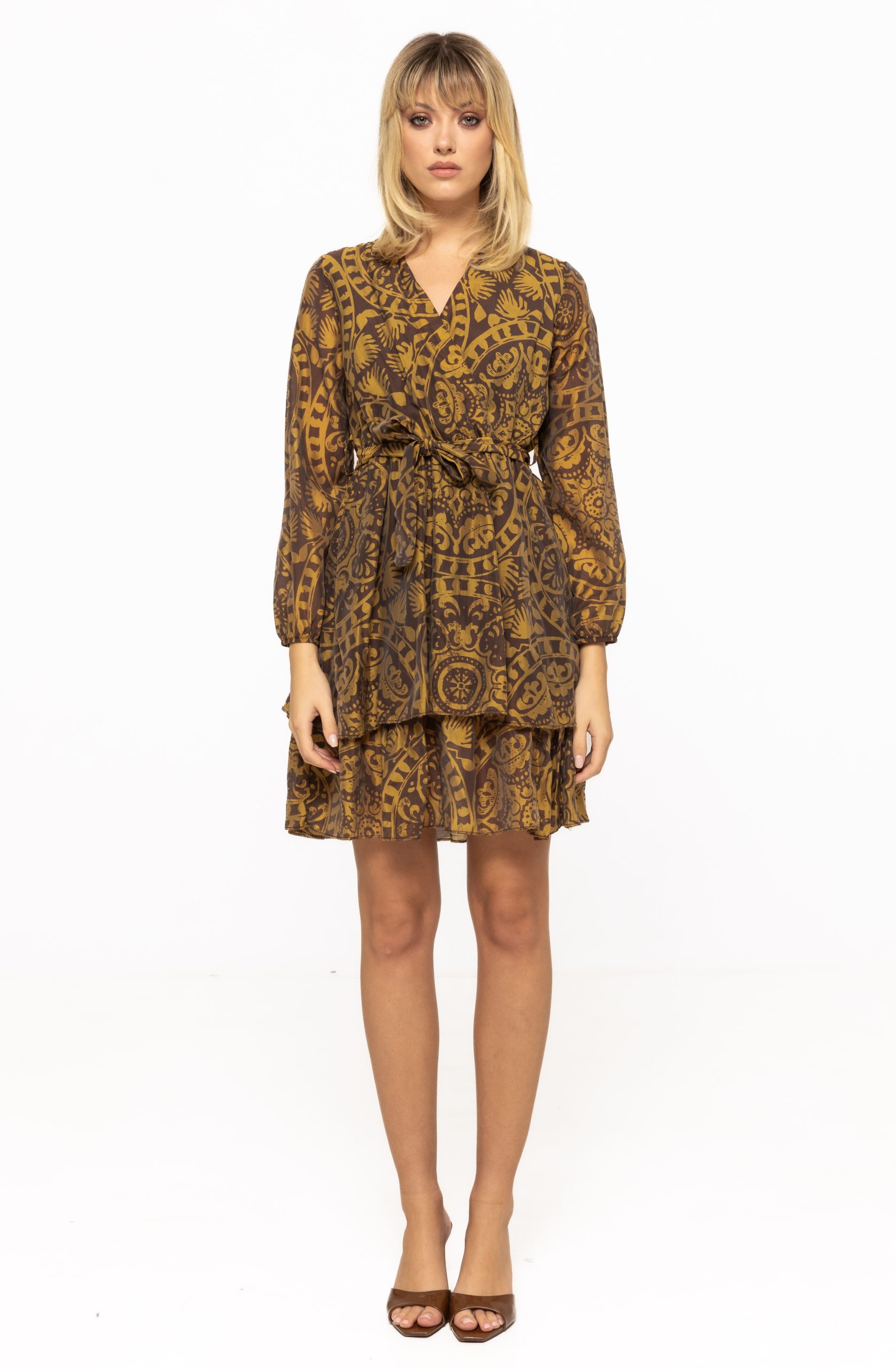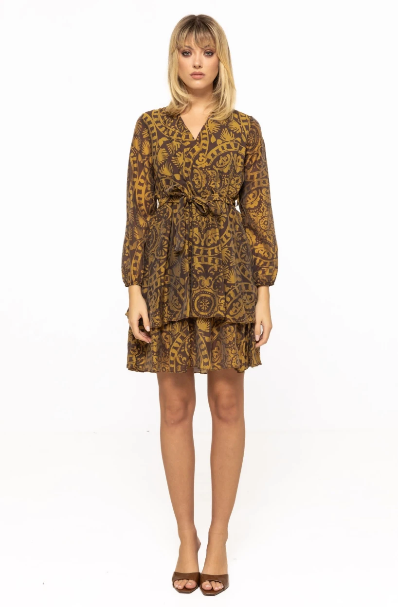 🌅 Pentru o apariție romantică: adaugă o pereche de sandale fine cu toc, cercei aurii și o geantă mică elegantă. Imprimeul colorat și croiala scurtă vor atrage toate privirile.