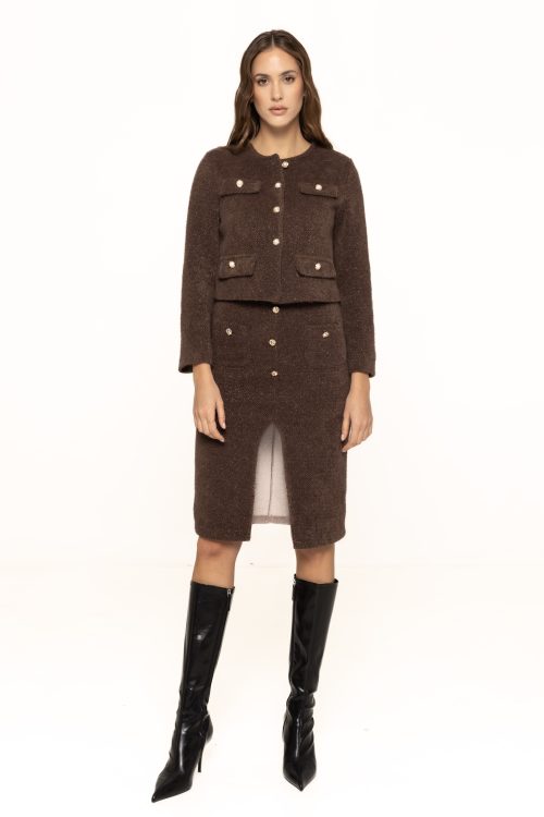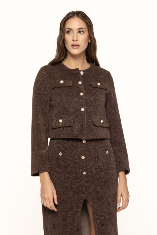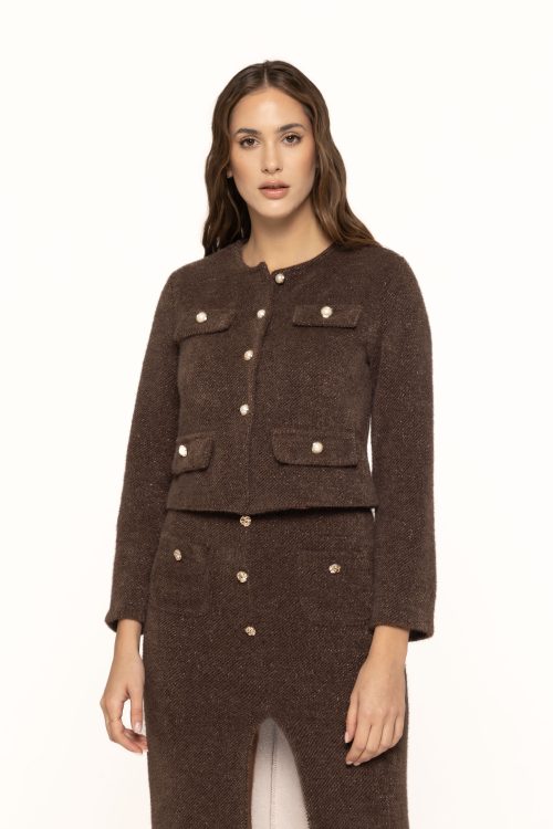 Unul dintre cele mai atractive aspecte ale acestui sacou este designul său scurt și modern, care se pliază perfect pe tendințele actuale din modă. Linia simplă este completată de nasturii decorativi dispuși simetric, ce adaugă o notă de rafinament și eleganță. Detaliile cu nasturi aurii sau perlați creează un contrast subtil și transformă sacoul într-o piesă statement, ideală pentru a fi purtat atât în ținute de zi, cât și în combinații mai elegante de seară.