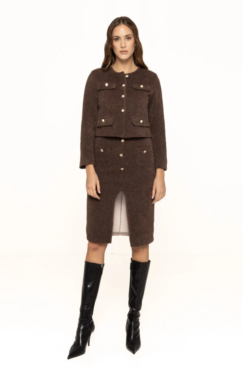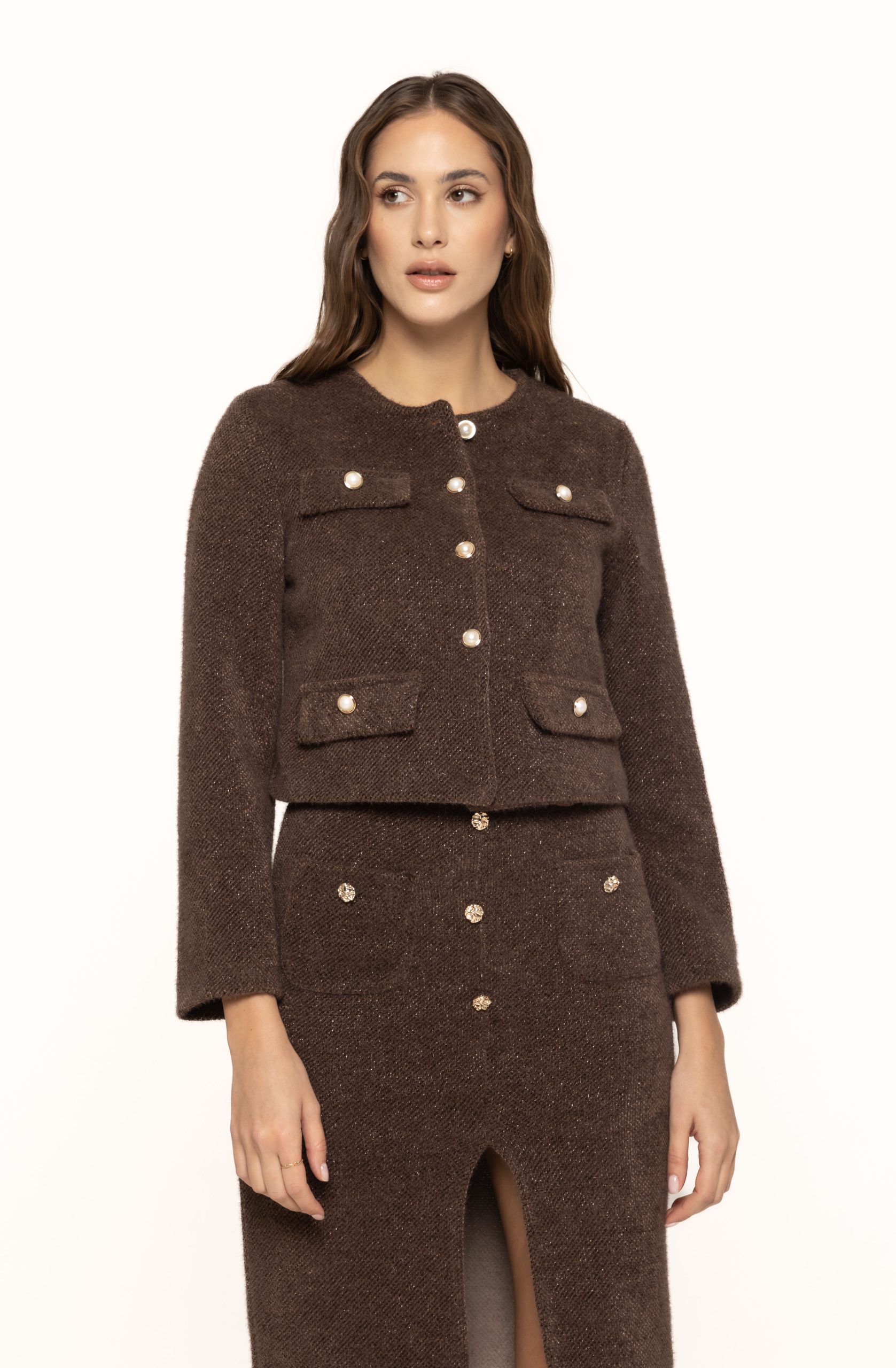Unul dintre cele mai atractive aspecte ale acestui sacou este designul său scurt și modern, care se pliază perfect pe tendințele actuale din modă. Linia simplă este completată de nasturii decorativi dispuși simetric, ce adaugă o notă de rafinament și eleganță. Detaliile cu nasturi aurii sau perlați creează un contrast subtil și transformă sacoul într-o piesă statement, ideală pentru a fi purtat atât în ținute de zi, cât și în combinații mai elegante de seară.