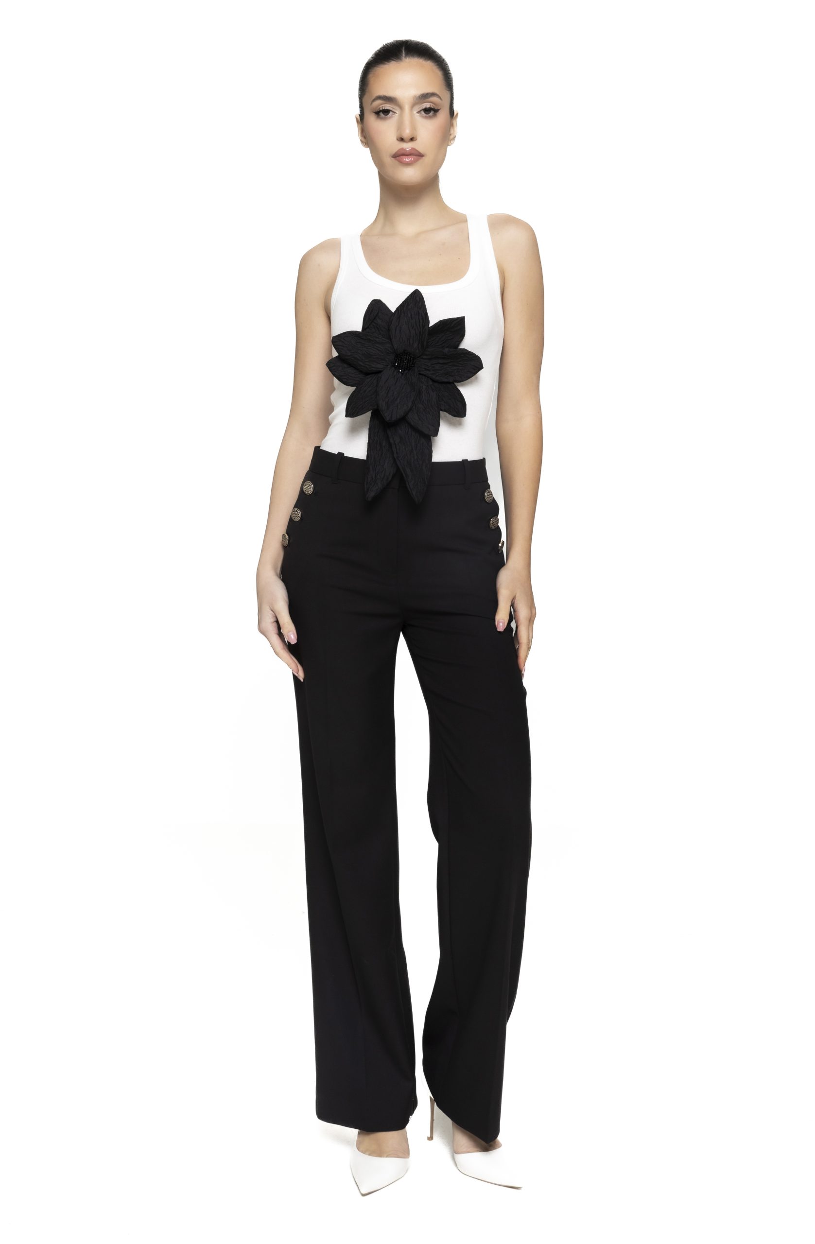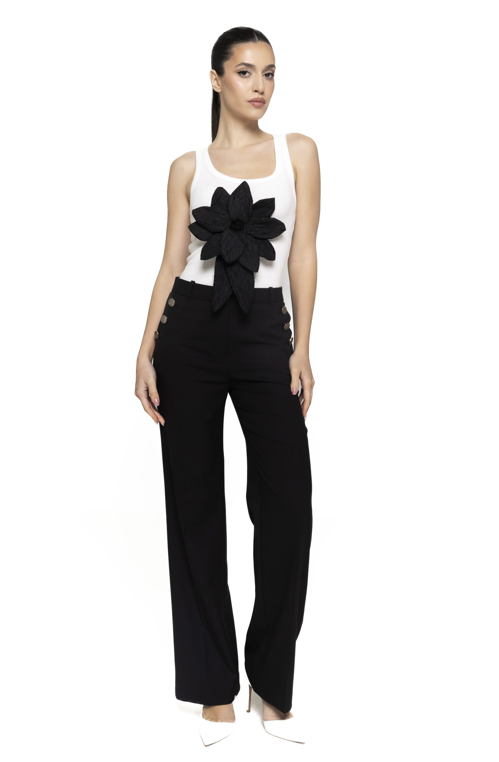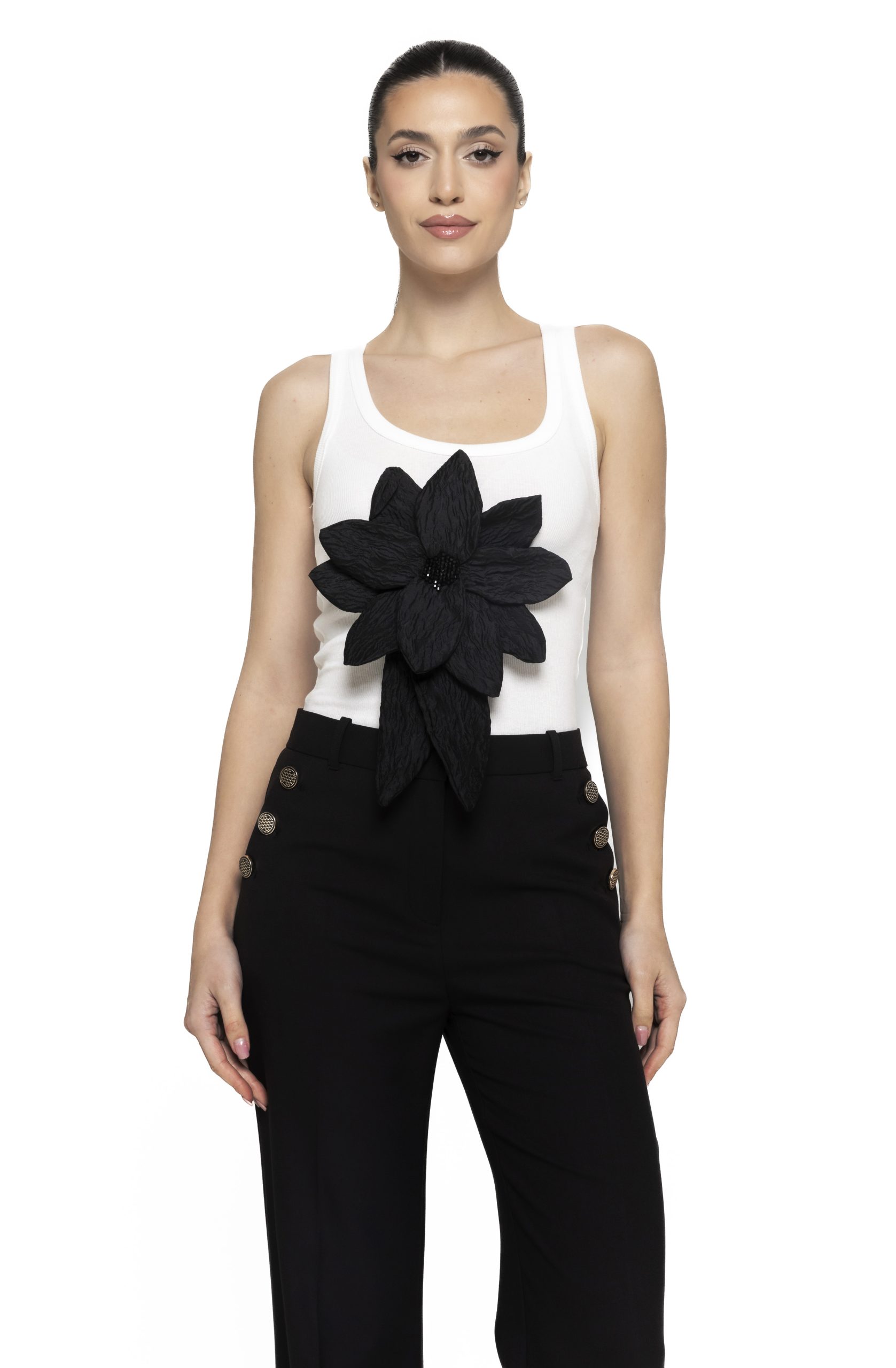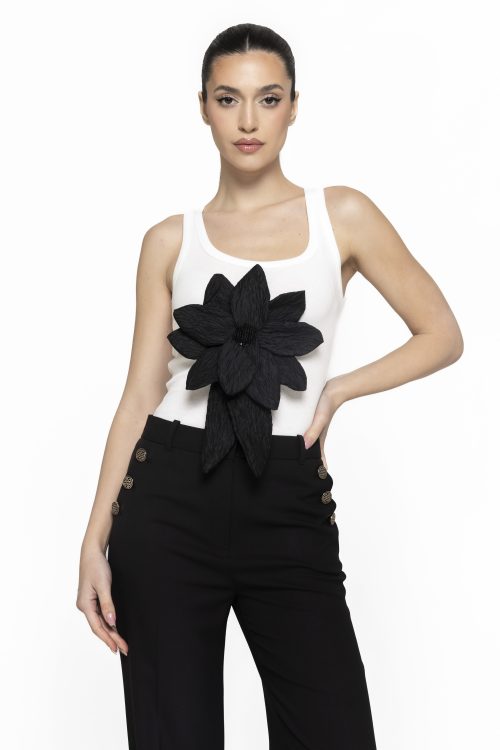 Elementul central al acestui top cu aplicație floare Bianca este reprezentat de floarea aplicată, un detaliu care adaugă un plus de rafinament și originalitate. Aceasta este poziționată strategic pentru a atrage atenția într-un mod armonios, oferind un aer romantic și modern în același timp. Aplicația transformă topul dintr-o piesă basic într-una cu personalitate, potrivită pentru femeile care apreciază detaliile fine.