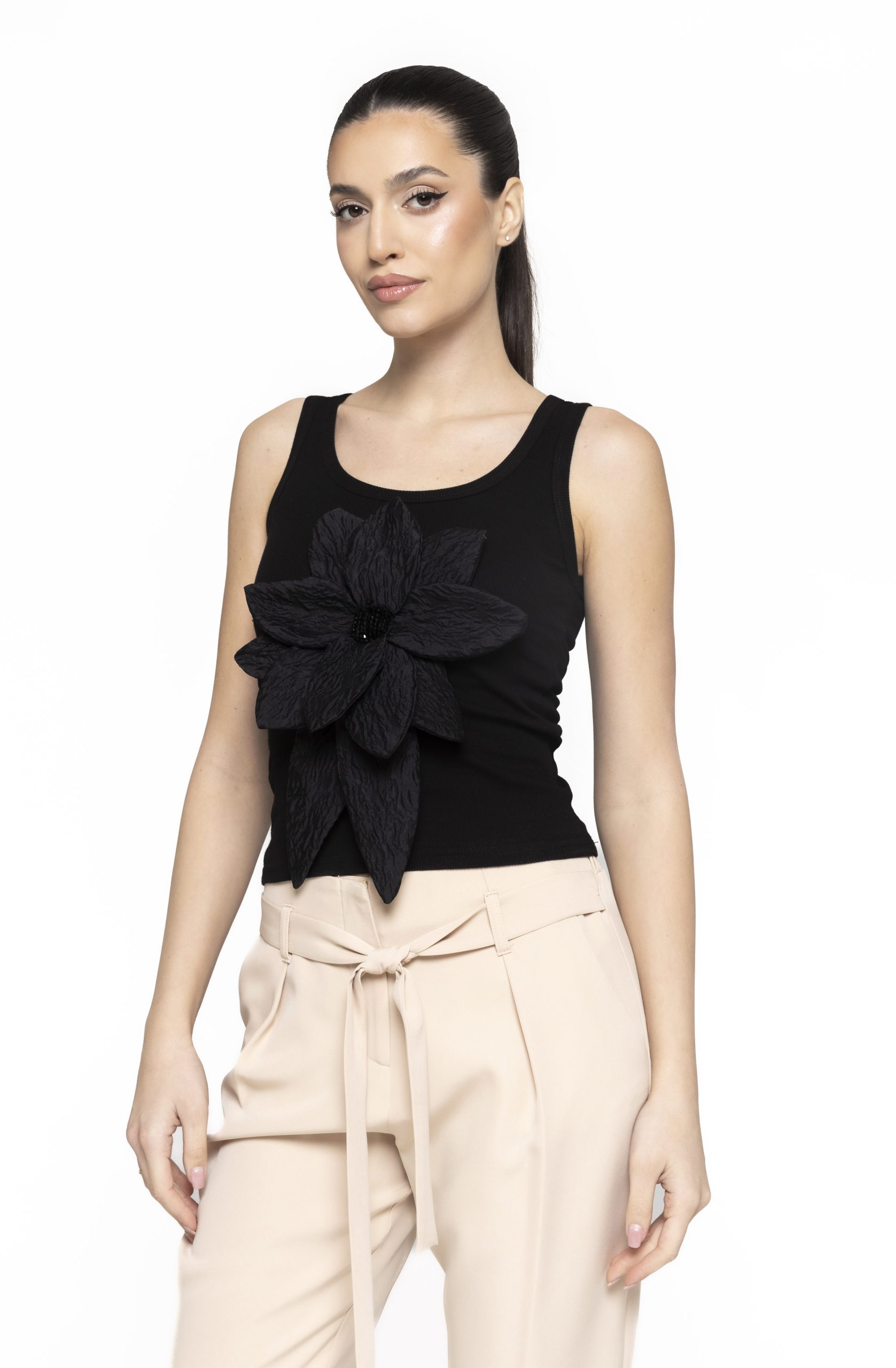 Elementul central al acestui top cu aplicație floare Bianca este reprezentat de floarea aplicată, un detaliu care adaugă un plus de rafinament și originalitate. Aceasta este poziționată strategic pentru a atrage atenția într-un mod armonios, oferind un aer romantic și modern în același timp. Aplicația transformă topul dintr-o piesă basic într-una cu personalitate, potrivită pentru femeile care apreciază detaliile fine.