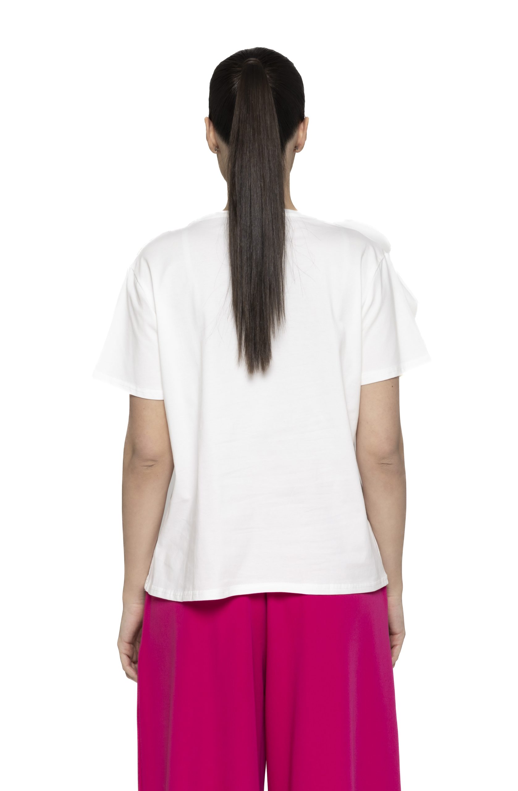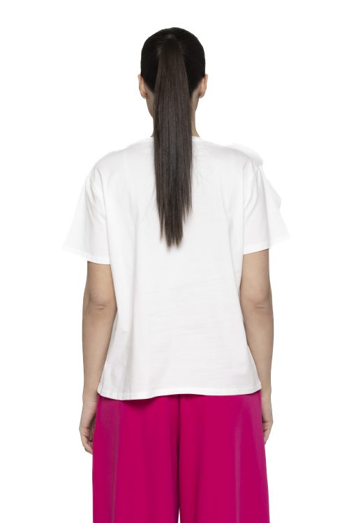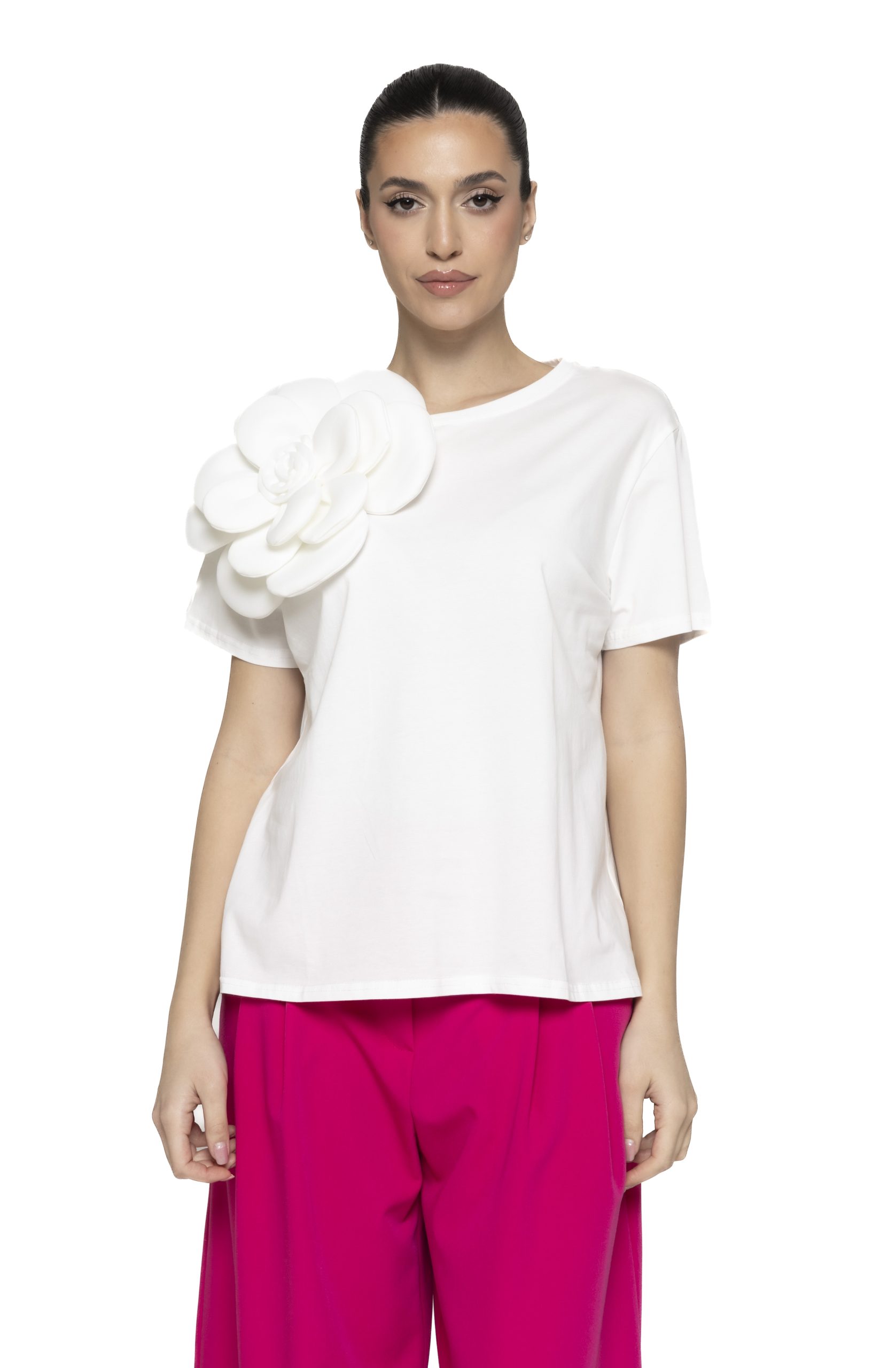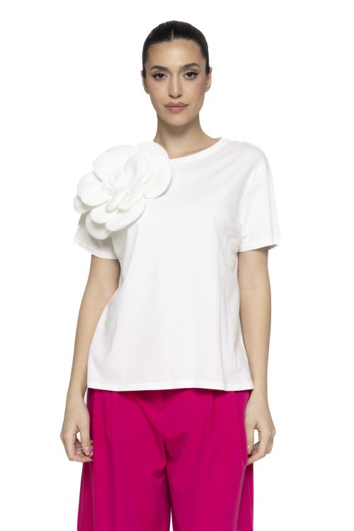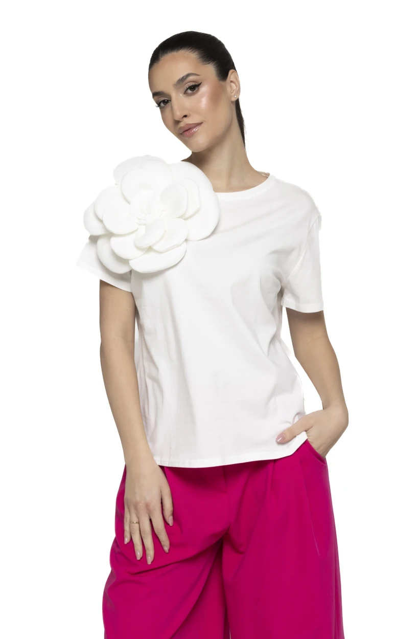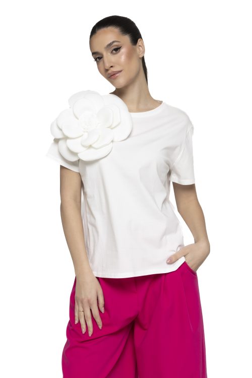 Un tricou basic, cu o croiala lejera, ce iese in evidenta prin floarea superdimensionata aplicata pe umar.